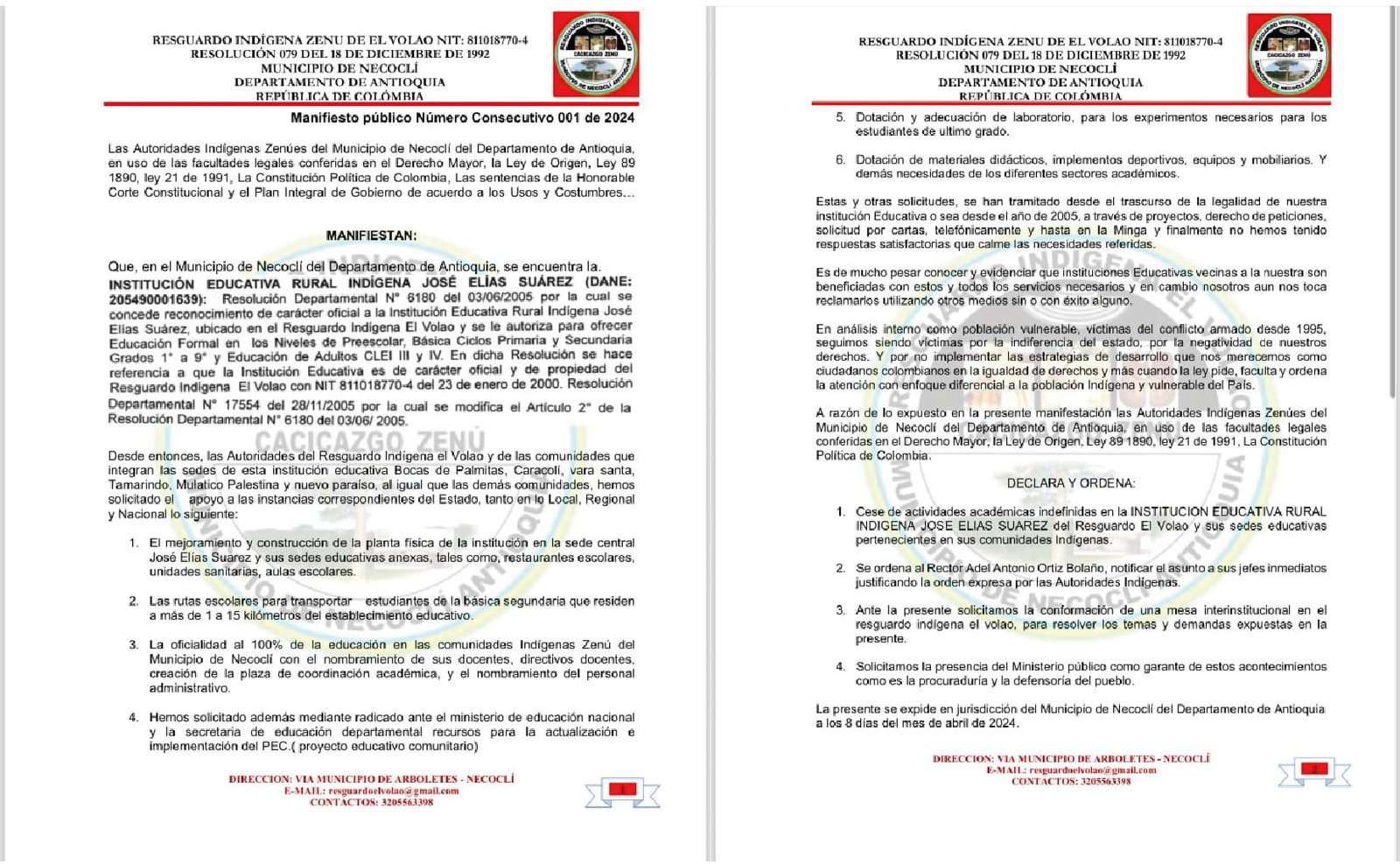 18 Abr, 2024 LAS AUTORIDADES INDÍGENAS ZENÚES DE NECOCLÍ DECLARAN CESE DE ACTIVIDADES ACADÉMICAS INDEFINIDAS EN INSTITUCIÓN EDUCATIVA Las Autoridades Indígenas Zenúes del...